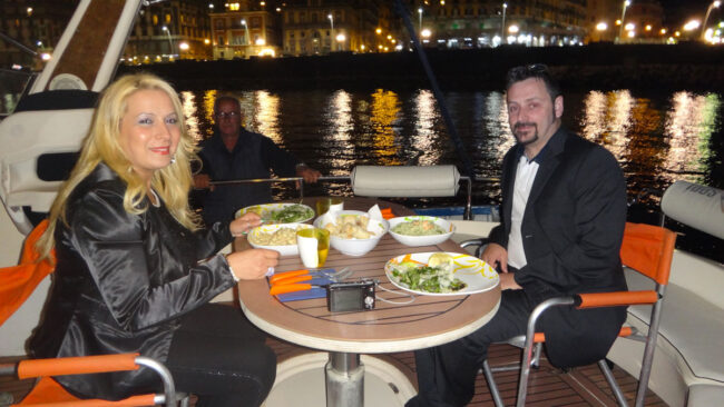 Una serata romanticissima, fatta dalle luci di questa meravigliosa citt, dal mare che ci ha accompagnato e dall’amore di Pietro e Ilaria che hanno scelto la nostra cena in barca